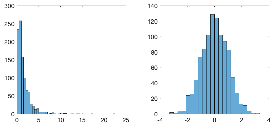Left: histogram of y which is highly skewed; right: histogram of log(y) which is close to normal